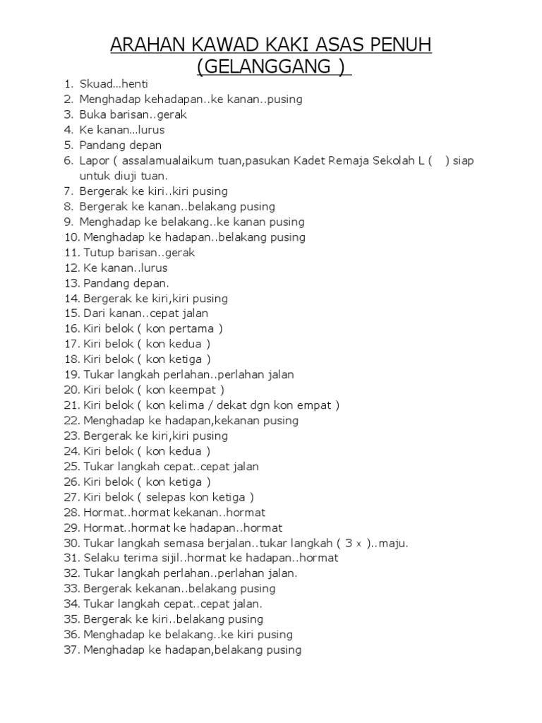 Arahan Kawad Kaki Asas Penuh from imgv2-2-f.scribdassets.com Anggota dengan pantas berlari 2. Such as png, jpg, animated gifs, pic art, logo, black and white, transparent, etc. Angkat tangan kanan paras bahu kepala ke kanan kaki bergerak untuk meluruskan barisan tangan turun dan kepala pandang depan semula. Kawad kaki pergerakan puteri islam malaysia ppim smktt 2018 muhd azizi. Arahan kawad kakiarahan platun masuk ke padang kawad dari kanan… cepat jalan kanan belok 2x berhenti ke kanan pusing dari tengah cepat jalan berhenti buka barisan… gerak ke kanan… lurus pandang depan arahan ketua platun melapor diri assalamualaikum. Asas kawad kaki pergerakan 1. Top free images & vectors for arahan kawad kaki in png, vector, file, black and white, logo, clipart, cartoon and transparent. Asas kawad kaki pergerakan 1.